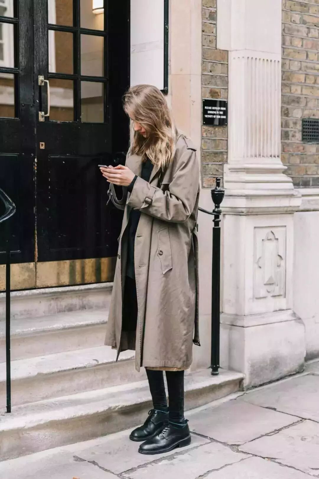风衣搭配牛津鞋,更加彰显飒爽气质。
