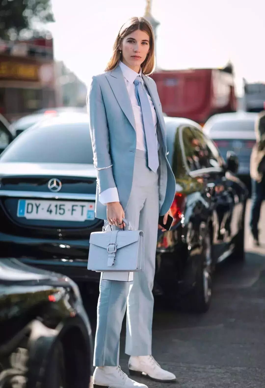 西装小外套+牛津鞋 ,干练利落,飘带衬衫则保留了女人味,可甜可盐。