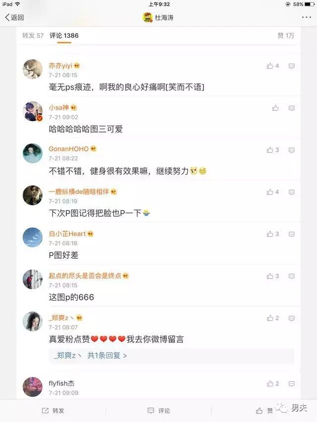 有网友调侃道:真的是毫无ps痕迹,可是我的良心好痛。哎,这就再次证明照片中的健壮身材并不是杜海涛的,而是他“偷”来的。有一张照片有点像他自己,因为两边赘肉很明显。不管如何,祝福他减肥成功,也祝福他能和沈梦辰修成正果吧!