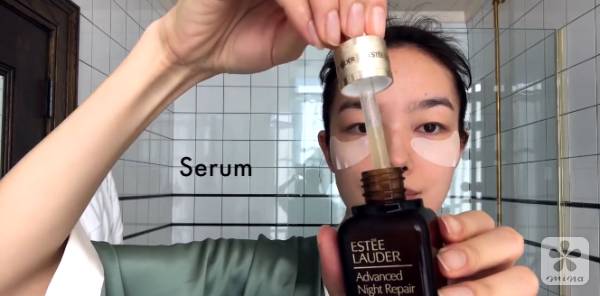 一边敷眼膜,一边在脸上涂上雅诗兰黛的小棕瓶精华液。
