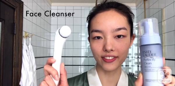 首先是清洁,孙菲菲使用的是雅诗兰黛焕采洁面泡沫,配合洗脸仪来清洁脸部。洗完记得用干净的洁面湿巾擦掉脸部残余的水分,不要用毛巾!