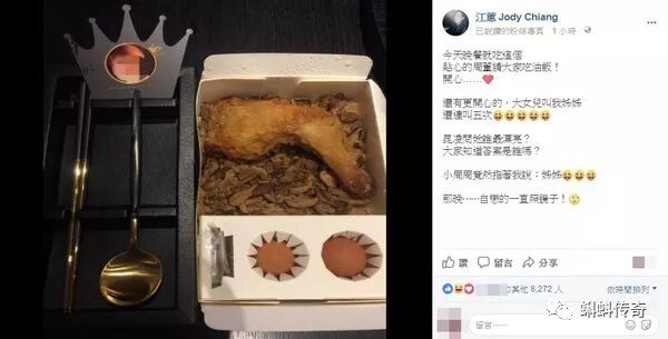 10月25日晚间,江蕙发文透露,收到周杰伦儿子的满月油饭,“今天晚餐就吃这个,贴心的周董请大家吃油饭!”此外,令她开心的是,小周周不但喊一连喊了她5次“姐姐”,当昆凌问女儿谁最漂亮时,对方的回答更是令她嗨翻天,“大家知道答案是谁吗?小周周竟然指着我说:‘姐姐’,那晚自恋的一直照镜子!”许多网友看完小周周和江蕙的对话后,纷纷嘴甜留言,“小周周很有眼光喔”、“二姐很可爱”、“小周周是位真诚的好孩子”,还有人开玩笑说,“周董终于兑现诺言了”、“他这次没忘了送,哈哈”。