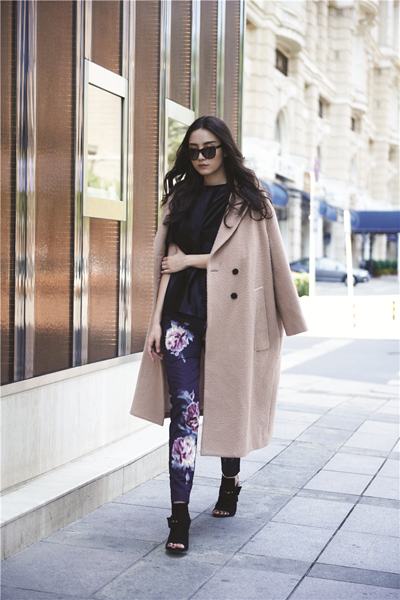 一袭冷峻装束让自身的强势气场彰显无遗。上身深蓝色绸缎上衣,看似孤傲且忧郁,给人以距离感;但视线下移,花团锦簇,紫色印花长裤青春奔放,恰如其分地中和了沉静色调,倍感亲切。肩披裸色羊绒大衣,高雅又简约,不动声色地将深色衣裤柔和到极致。