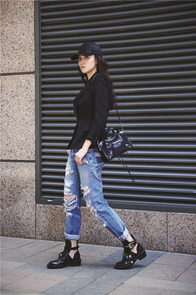 棒球帽是混搭必备的单品,看似保守的黑色,确能准确传递运动时尚感。热衷丹宁风情的宋佳选择带有乞丐风的破洞牛仔裤,破一点,肥一点,轻松晋升街头“主旋律”。女性的军装外套,避免了一贯的僵硬感,多口袋的设计,大大增强实用性。鞋履和配饰的选择具备极高的品质感和价值度。