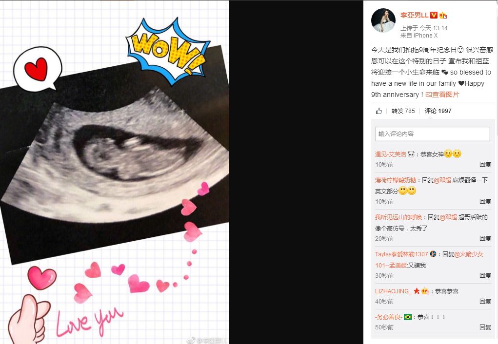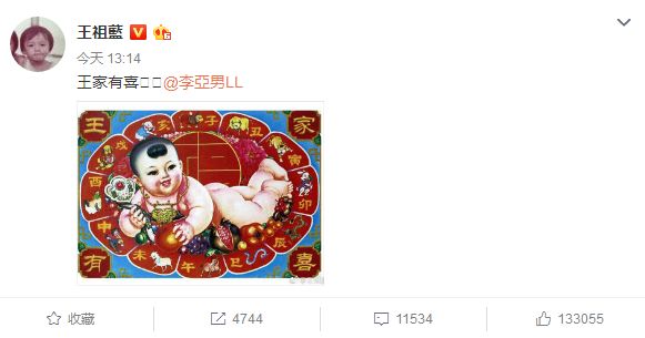 13日下午,王祖蓝微博宣布妻子李亚男怀孕喜讯,妻子随后转发晒出B超照,“今天是我们拍拖9周年纪念日,很兴奋感恩可以在这个特别的日子,宣布我和祖蓝将迎接一个小生命来临。”