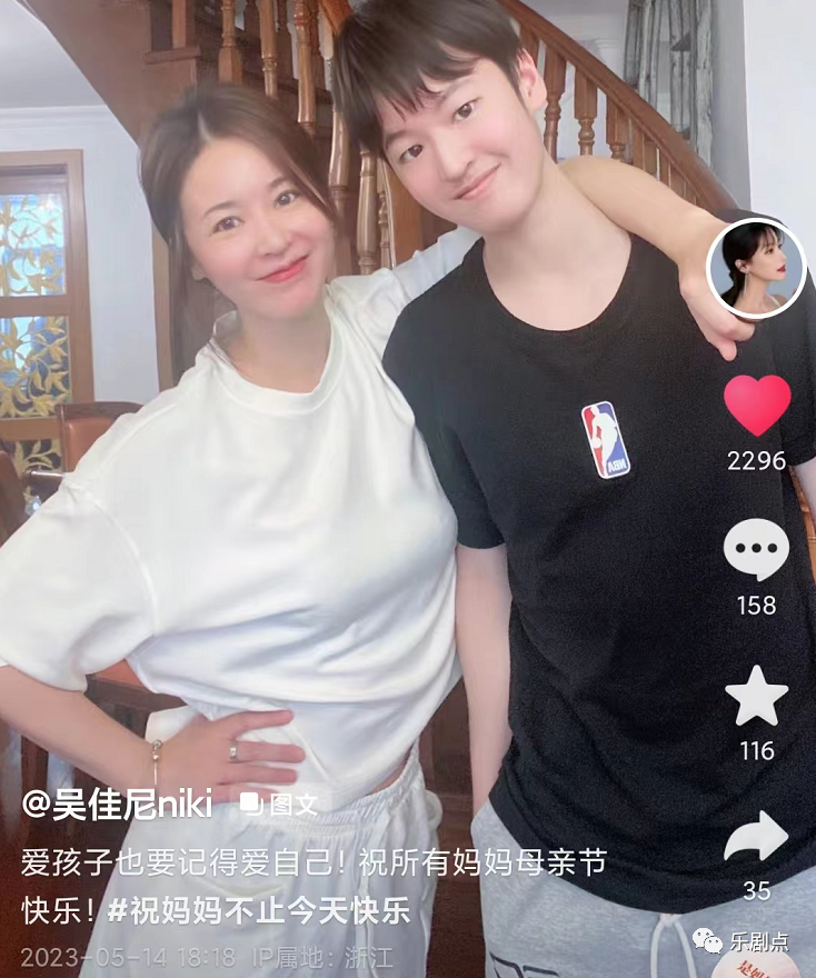 曝光的近照中,吴佳尼与俩儿子在家庆祝母亲节,她家似乎是一套别墅,背后的木质结构楼梯非常抢镜。