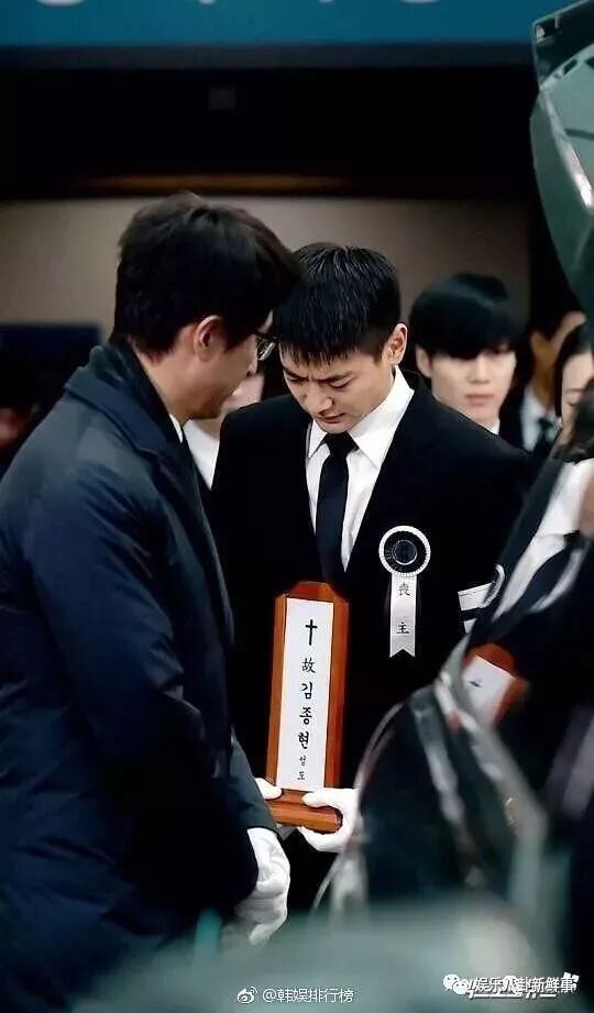 SHINee成员珉豪拿着钟铉的灵牌走在送殡队伍最前方。