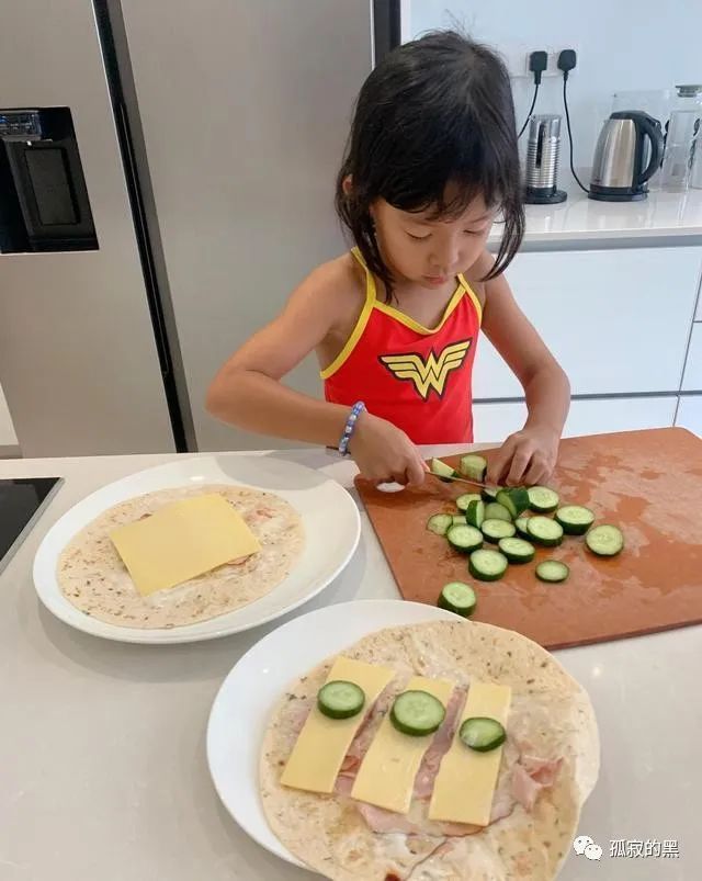 不过Harper对于厨房似乎尤为的喜爱,这也让她和同龄的小孩子比起来成熟了不少,另一张照片中的她换上了一件红色的背心,红黄搭配的颜色虽然让她更黑了不少,但是不得不说手拿菜刀切着黄瓜的Harper还是有着别样的魅力的,虽然黄瓜切的大小不一,但是对于一个5岁的孩子已经是十分厉害了,而看一旁的成品也是配料丰富,营养均衡。