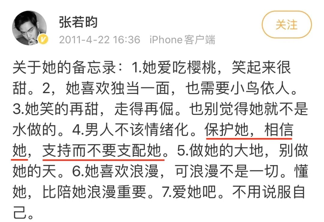 “张若昀,醒醒吧,唐艺昕不是你的!” 窈窕妈妈 内地男星 2020-11-02 19:25:16 950 创作不易,用心坚持,欢迎请BaGua喝几杯爱心咖啡!打赏并支持本文 打赏并删除本文 10年,对很多娱乐圈夫妻或者情侣来说,好像有点太长了。长到足够演完好几场出轨、分手、离婚、撕逼大戏。但是张若昀和唐艺昕,还在演他们的偶像剧。前段时间,唐艺昕产后复出,在微博上发了一组活动照片。张若昀先是在评论里表白“感谢上天,陪你一起走过”,随后发微博秀恩爱:这是我老婆,也是我孩她妈。我尊重她,敬佩她,而也是她陪着我走过艰难岁月。我爱她就像她爱我。这条微博里,还有一个隐藏“彩蛋”。图是从唐艺昕微博上“盗”的,带着水印。于是我们看到,照片右下角:两个人般配的情侣名重叠在一起。暗戳戳地撒狗粮,齁得人猝不及防。没想到的是,张若昀居然因为“贬低”唐艺昕被狙了?微博里,张若昀称呼唐艺昕为“我老婆”“孩她妈”,被网友认为是在贬低、物化女性,他根本就不爱唐艺昕。还有人拉来李荣浩,“有理有据”地打脸张若昀。总而言之一句话:张若昀,你醒醒吧,唐艺昕不是你的!她是她自己!只能说,网友咬文嚼字的功力是越来越强了。照这么说,女人说“我老公”也是在贬低男性?那为了表示“尊重”,他应该怎么说呢?“大家好,这是演员唐艺昕,代表作有××,工作接洽:×××××。”也太搞笑了。更夸张的是,有“神通广大”的夏洛克·网友·福尔摩斯断言:张若昀出轨了,在跟老婆道歉。如果现在没出也别急,他早晚会出的!只能说,网友们不仅阅读理解“满分”,推理能力也了得。我想,我们不应该通过揣测和想象去评判一个人,而要看他的所作所为、所思所言。更多人“看见”的张若昀,是发自内心尊重妻子的丈夫,是初心不改的演员,更是富有情趣又通透清醒的男人。“爱是支持,而不是支配”那些攻击张若昀不尊重唐艺昕的人,大概不知道,早在9年前,他就说了:“保护她,相信她,支持而不要支配她。”9年后,她生了孩子,复出工作,他全力支持。在他看来,她不仅仅是一位妻子和母亲,更是一名演员,一个独立的人。不以爱之名控制对方,让她去做自己想做的事,不就是一个男人对伴侣的尊重?之前电视剧《十五年等待候鸟》热播,他做了一场直播。关于送礼物,他说绝对不能送女朋友厨具。“女生可以下厨。她想下厨就下厨,但不要觉得女生就应该下厨。”跟那些认为女人下厨天经地义,男人进厨房就是没出息的男人不同,张若昀一点不觉得男人做饭丢脸,反而十分享受。他喜欢做饭,也喜欢为唐艺昕做饭。@张若昀对她,他温柔以待;对其他女性,他也能得体而周全地照顾到。当初毛晓彤被劈腿分手,宣传新剧时被记者追问感情问题,一脸难堪。同剧组的张若昀挺身而出,说:“拒绝回答这个问题,有什么事冲我来。”图片来自网络这样的张若昀,实在太男人太圈粉了。他的绅士和体贴,不仅仅出于礼貌和教养,更源于强大的同理心和对人的体恤。被狗仔偷拍,遭受无端的猜测和指责,他也尽量温言细语,而不是恶语相向。“我希望,冰冷的网络背后,大家还是能做一个温暖如春的人。”甚至对一匹马,他也怀有无限的敬重和深情。剧组杀青后,他洋洋洒洒为它写了一篇长长的“小作文”。对他来说,它是一个有血有肉的伙伴,而不是没有感情、没有尊严的牲畜。他对伴侣、对女性、对人、对生命的珍重,是刻在骨子里的,是发自内心的尊重和爱护。想想那些出口就是“你腿很粗哦”“还不是我在养你”,对服务员大呼小叫的男人,张若昀是“宝藏男孩”无疑了。一个男人靠不靠谱看看他对事业的态度10月19日,张若昀发微博透露《庆余年2》即将启动。2019年,《庆余年》霸屏网络,张若昀人气大增,演艺生涯一路开挂。剧中他的演技自然纯熟,跟陈道明、吴刚这些老戏骨搭戏,竟然毫不逊色。有人说,范闲一角让张若昀真正迈入了实力派演员的行列。《庆余年》之前,张若昀被认定为“小鲜肉”,但这枚“小鲜肉”志不在收割流量,而想做一个“手艺人”。《有数青年》2017年12月,张若昀在北京保利剧院首次出演话剧《三姐妹·等待戈多》。这部林兆华导演的作品,就算在话剧里,也是最不商业的几部之一。在此之前,张若昀凭借《麻雀》获得国剧盛典最具人气男演员奖;《法医秦明》点击量突破12亿;而他主演的电视剧《亲爱的她们》在湖南卫视热播。换成其他年轻演员,肯定“乘胜追击”,多接几部电视剧或综艺,名利双收。但是张若昀推掉了无数电视剧和综艺的邀约,选择走上舞台。《三姐妹·等待戈多》舞台是他的初心。他可以卸下一切包袱,只专注于表演本身。81岁的林兆华看完张若昀排戏后,对他赞不绝口:“这小明星挺好的,身上没有流里流气的东西,表演很朴实。”为了排好这部戏,他背词到半夜2点。之前拍《黑狐》,他连续发烧一个星期。早上4点打点滴,8点准时开工,晚上12点拍完,再去医院打2小时点滴。再辛苦,演戏对他来说都是一件开心的事,是生活的解药。翻遍他的微博,发得最多的,除了新剧的宣传,就是他对演戏的理解,他写给剧中角色的“情书”。字里行间,满满是一个热血少年对演戏的赤诚,对角色的珍视与共情。他说,演员就是在别人的人生中漂流。演过就替他活过。他不是在演他们,他是在活他们。没有人能随随便便成功,哪怕是在一夜成名看似家常便饭的娱乐圈。不浮躁,不取