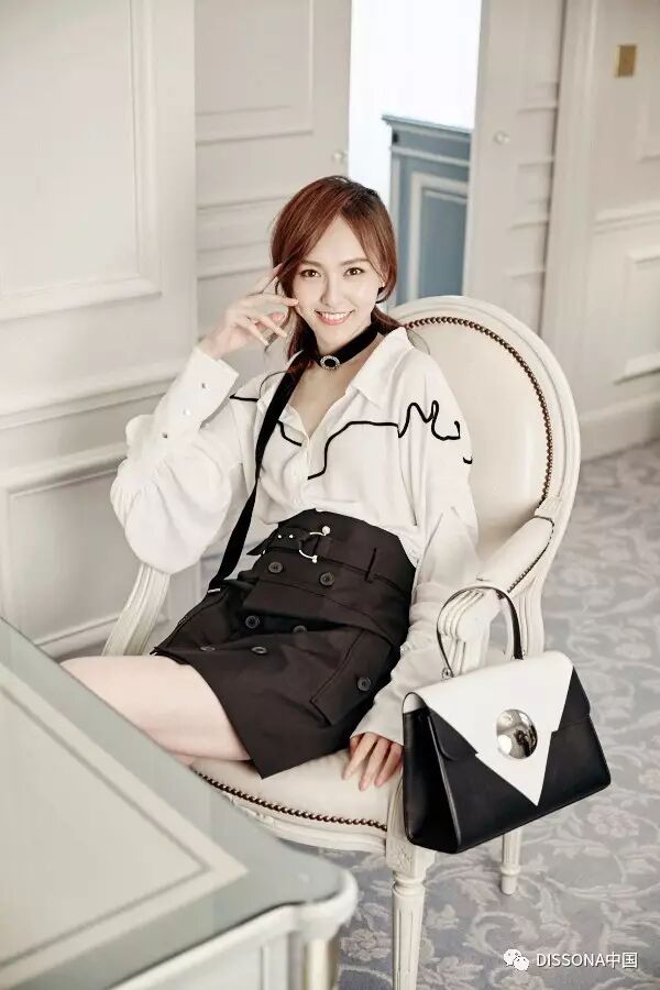 唐嫣肩上的这款黑白双拼圆扣提包,正是DISSONA的全新秘印包,以上世纪80年代盛行一时的孟菲斯艺术(Memphis)重塑,波普几何与明黄颜色碰撞的肩带,为原本优雅的提包增添活泼感。