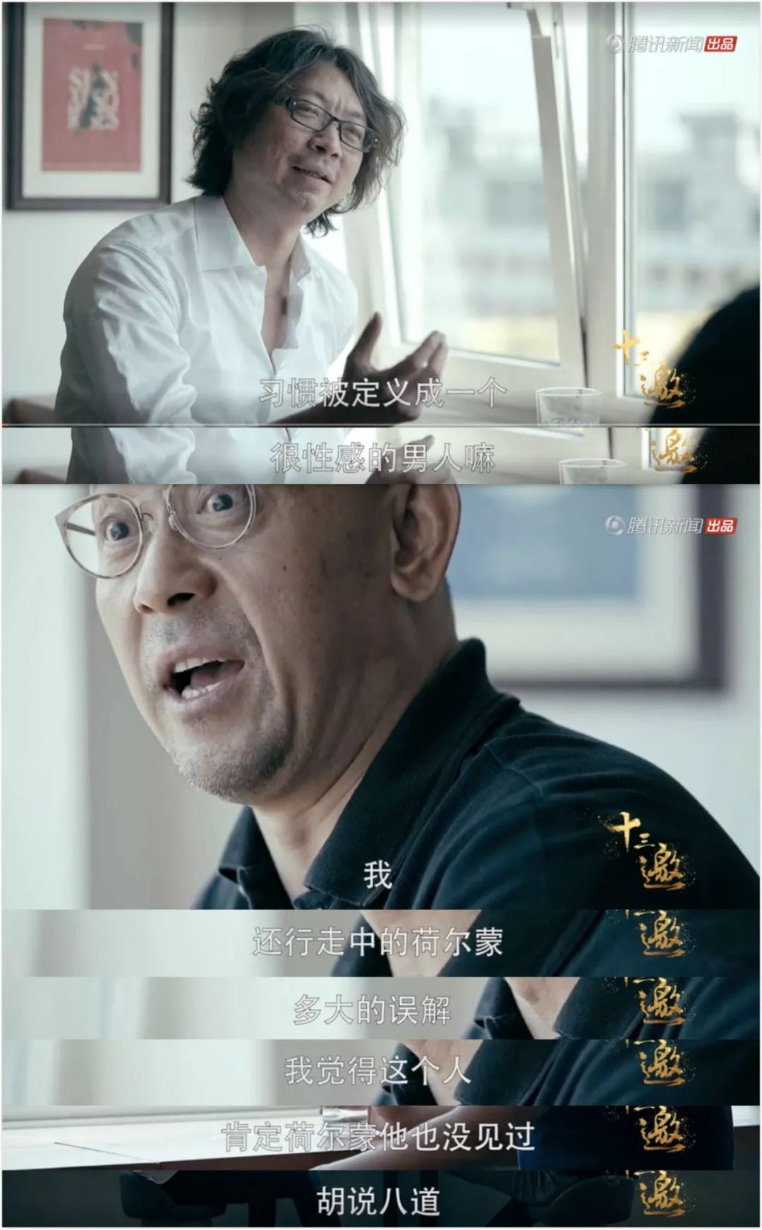 最近许知远在《十三邀》中问过姜文一个关于性感的问题,他说很多人都说姜文是行走的荷尔蒙,姜文却说这是一个天大的误解。我认为他这跟林青霞“美而不自知”没什么两样。发小洪晃口中的姜文就是“少有的男女通吃”,因为“男的崇拜他爷们儿,女的喜欢他男子汉的感觉”。史航评价姜文:“姜文是个骄傲的人,但不是个傲慢的人,有很多表面上比他低调的人,其实都特别傲慢,他就是骄傲。他知道自己是好的,但是不知道你们会不会觉得他好,但又觉得这其实没什么关系。”