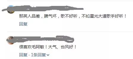 现在已经55岁的毛阿敏在家庭逐渐稳定,又渐渐地出现了观众的眼前。很多网友,又拿她与那英相比较,纷纷表示了对毛阿敏的好感,很多网友说:“那英人品差,脾气坏,歌不好听,不如星光大道歌手好听!”。