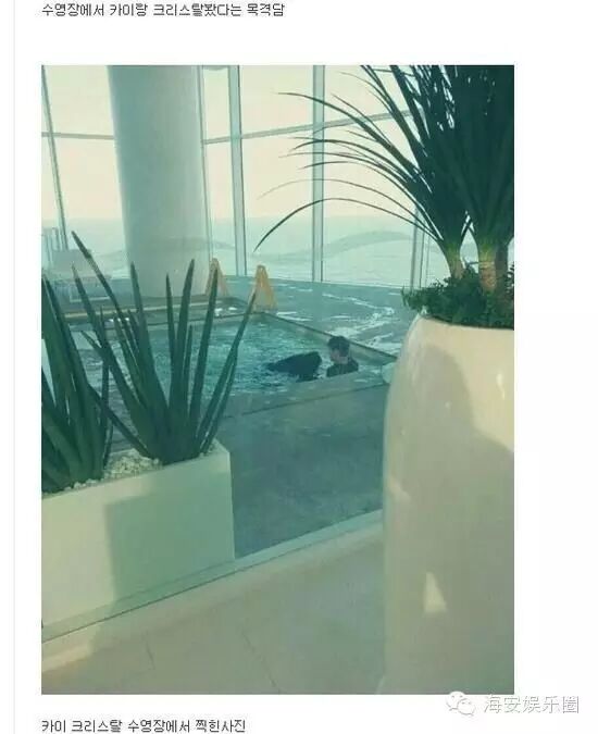 韩国网友在《Pann》论坛爆料,表示Krystal和Kai曾一起到江原道某家饭店约会,还加码上传1男1女在游泳池边接吻的照片,直指照片的主角就是Krystal和Kai,消息一出,立刻就被疯传,掀起一阵热议。