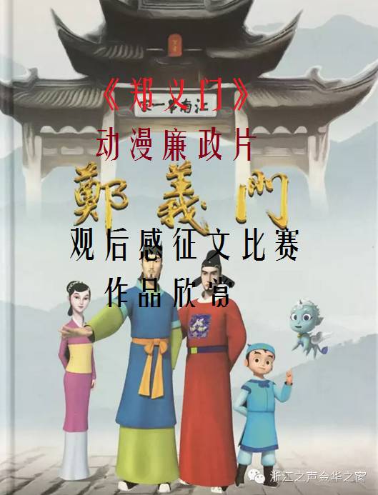 “千年江南镇,浦江郑义门,同堂亲如初,共著孝义书……”随着稚嫩的童声响起,廉洁动漫片《郑义门》的故事徐徐展开。短片通过轻松活泼的画面、生动有趣的故事,将《郑氏规范》所蕴含的深刻道德教义,进行了完美的诠释。作为郑氏后人,在观看短片时我倍感自豪与荣耀,同时也深刻感受到《郑氏规范》的精神实质在于,制家规明道以致用,教族人崇法以尚德。
