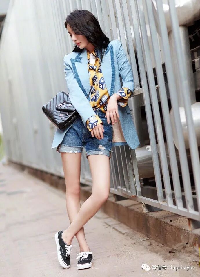 其实我发现像郁可唯这样,身穿西装也依旧大秀美腿的时髦穿搭已经在时尚圈里见怪不怪了!时尚女王杨幂在早前的街拍中,身穿蓝色西装外套内搭黄色印花衬衫,下身配以牛仔短裤和球鞋,展现出学院风时尚穿扮的同时还不忘记大秀美腿。