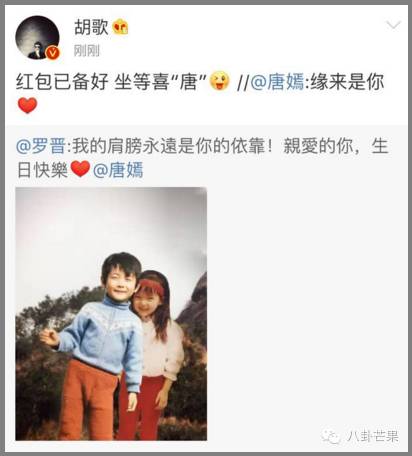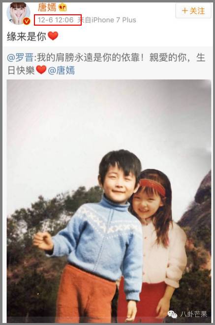落地时间很甜!罗晋掐准了12月6日的12:06发布,虽然图片是P的啦!但没有发锦衣华服大美瞳十级磨皮自拍,发小时候的照片,有种返璞归真的感觉。唐嫣立马转发,转发时间稳稳控制在12:06。
