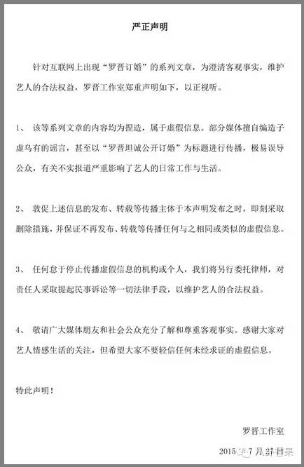 2015年播《克拉恋人》的时候,两人的绯闻到了白热化阶段,甚至传出订婚。但是罗晋严肃到发声明否认,不过否认的是订婚,并没有否认恋情啊
