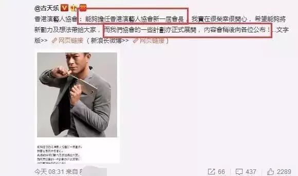 都说新官上任三把火,古天乐的火还没有烧起来,不过他发了微博,称有一些计划将会陆续公布,看来他一上来就制定了很多机会,都是他对协会的想法。