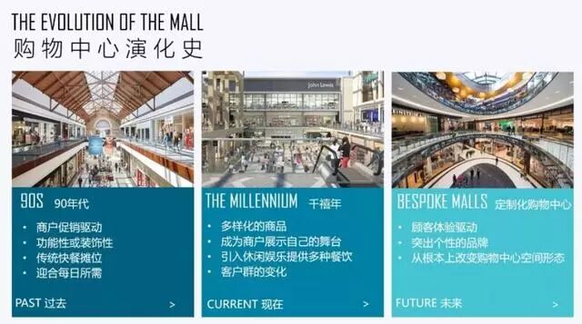 从功能层面看,购物中心的演化已从过去90年代的普通购物场所,转变为千禧年提供多样化商品、提供商户展示舞台、引入休闲娱乐、提供多种餐饮的综合性购物场所。未来的购物中心将是以顾客体验驱动、拥有突出个性的品牌的定制化购物中心,这将从根本上改变购物中心的空间形态。