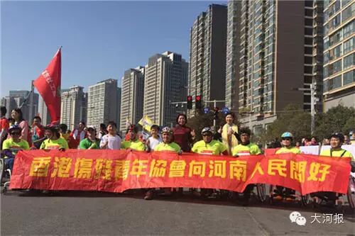 香港伤残青年协会打出向河南人民问好的横幅,河南人民向他们的到来表示欢迎吧!
