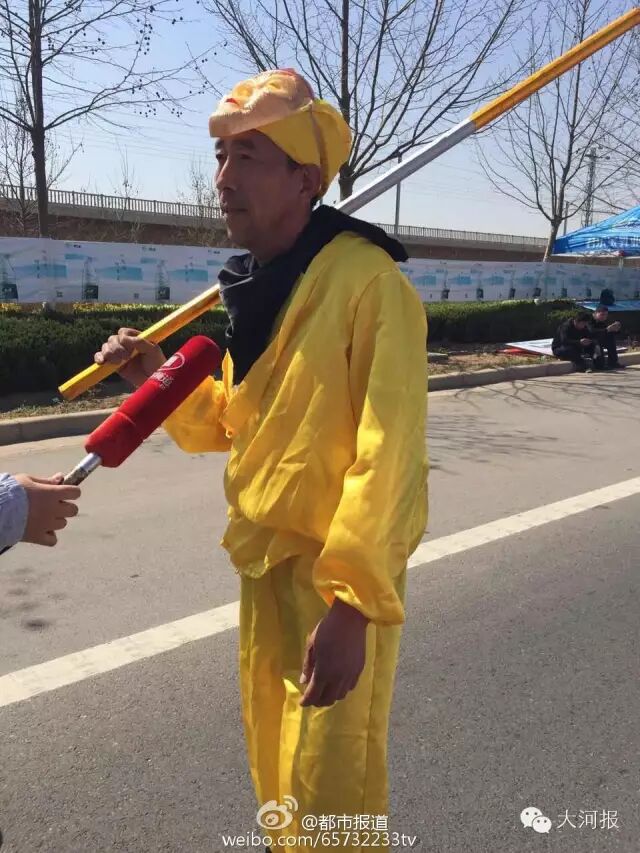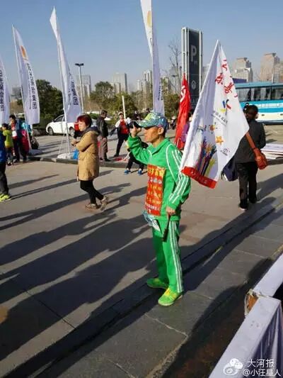 这位大爷76岁了,扛着广告旗半程要跑多久?