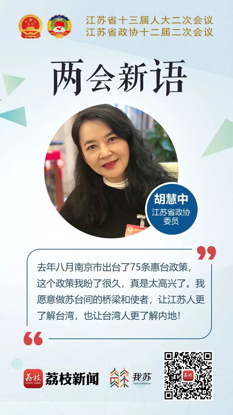 作为一名旅居台湾的江苏人,胡慧中动情地表示自己一直想为家乡做点什么,这次终于有机会了。“我希望这次的提案能得到领导的支 持,我可以做江苏和台湾之间的桥梁和使者,也是我2019年最大的心愿了!”
