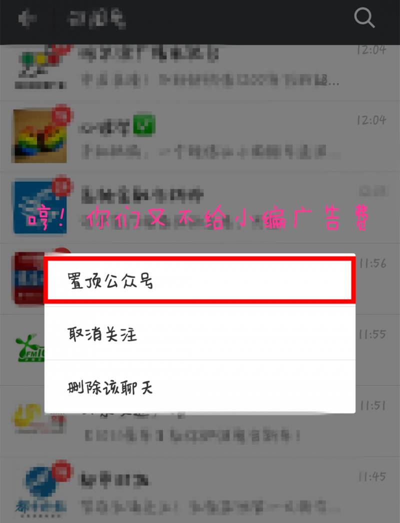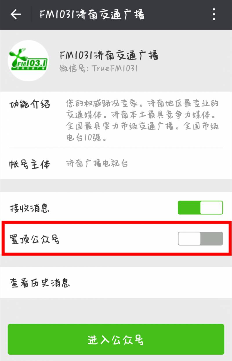 像“FM1031济南交通广播”三观这么正的微信公共账号,你舍得因为关注了太多垃圾账号、推送时间和你拉屎时间不一样而错过精彩内容么!!!赶紧置顶吧!可以同时置顶多个号!但建议置顶这一个就够了!置顶太多了和没置顶有毛区别!好了小编咆哮完了!