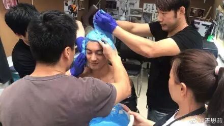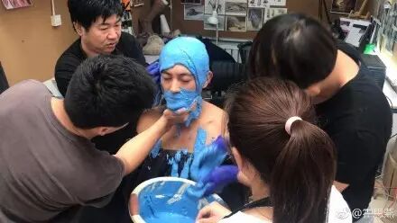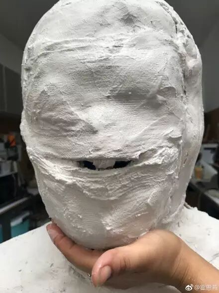 照片中的杜江一脸严肃不能做任何表情,被完完全全地包在模具中。