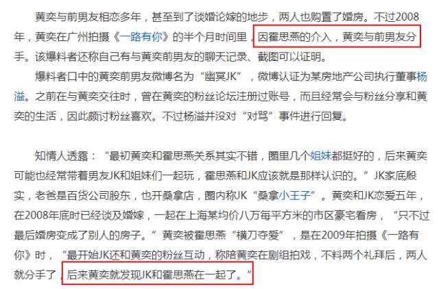 黄奕经常带着男友出席姐妹们的聚会,一来二去杨溢便与霍思燕相识。然而没过多久,杨溢便和黄奕分手了,反而传出与霍思燕的蜜恋。