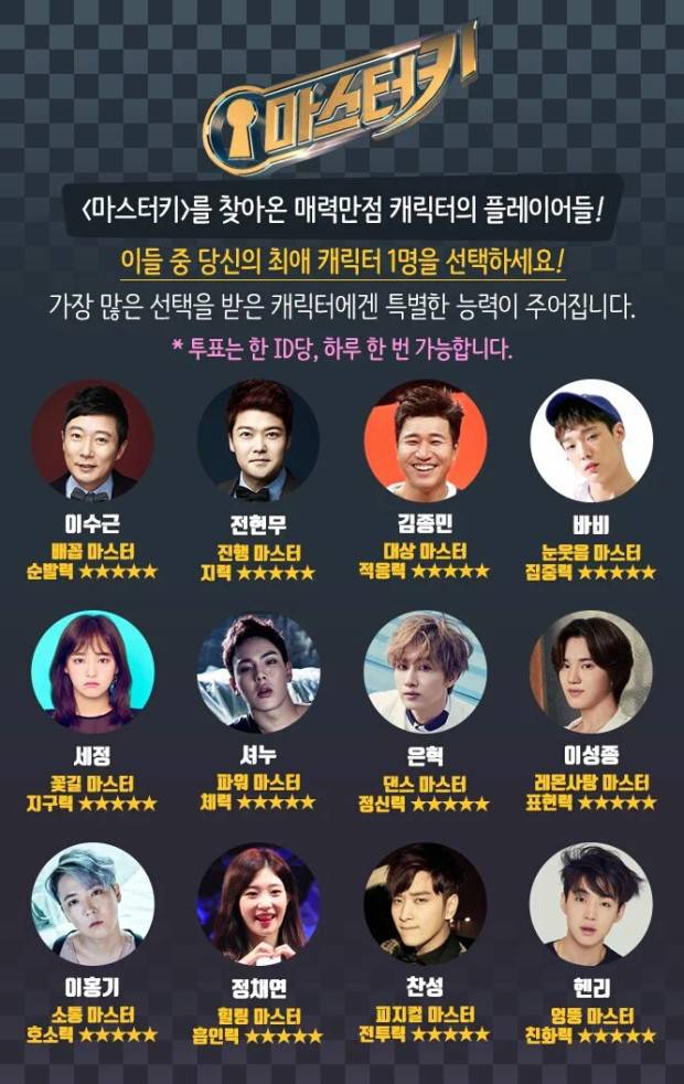 6日上午,SBS全新综艺<MasterKey>制作组方面通过官方SNS宣布公开第二组玩家阵容,并开始新一轮投票。<MasterKey>官方主页(tv.sbs.co.kr/masterkey)公开了第二组玩家阵容,共包括12位明星,李秀根-全炫茂-金钟民-BOBBY-金世正-Shownu-银赫-李成种-李弘基-郑采妍-黄灿盛-HenryLau刘宪华。节目将于10月14日下午6时20分(韩国时间)首播。