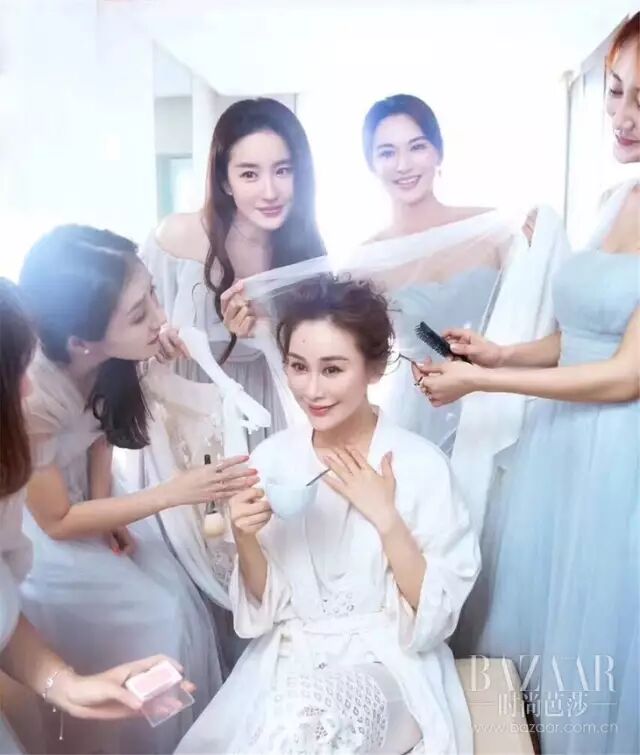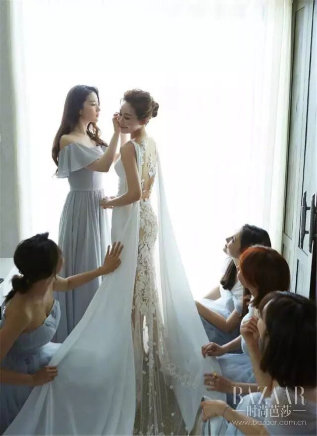 千万不要以为刘亦菲只负责美美哒,人家这个伴娘当得很尽责。看,为新娘戴耳环的样子有多认真。