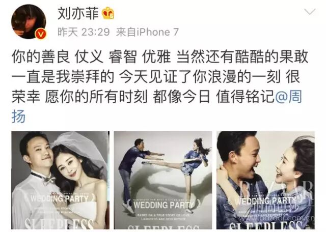 刘亦菲一向低调这事儿都知道,不过粉丝们也是real辛苦,自家明星跑去当伴娘的事还是看了别人的微博才知道。