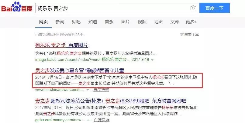挖贝网注意到,贵之步董事长郑靖涉嫌合同诈骗案中的受骗人疑为著名主持人汪涵妻子、知名主持人杨乐乐。从媒体报道看,汪涵妻子杨乐乐此前与郑靖交往比较密切。挖贝网以“杨乐乐 贵之步”为关键词在百度搜索发现,贵之步、郑靖与汪涵妻子杨乐乐之间确存在关联关系。