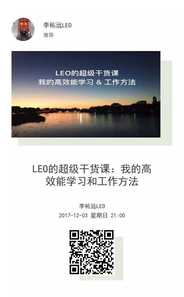 谢谢所有上周日(12月3日)参加第三节【LEO的超级干货课】的小伙伴。Guess what, 你们的热情刷屏让强大的荔枝微课平台崩溃了将近半小时。这节课我讲得很爽,不小心又拖堂到三个半小时,相信大家也用了不少时间消化所有干货。这节课的所有内容都不会过期,现在依然可以报名,扫描下方图片中的二维码即可。另外,我在荔枝微课直播间曾上过的两堂课:如何学习英语和商学院申请经验分享也仍然可以报名,进入我的荔枝微课个人页面即可看到这两节课 :-)