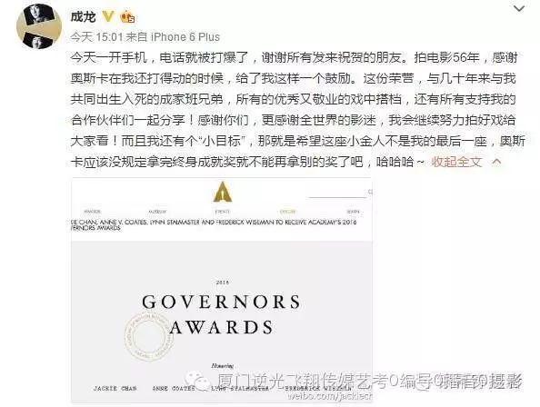 网友表示:“成龙得终身成就奖太棒了,他就是动作类型片的查理卓别林。”
