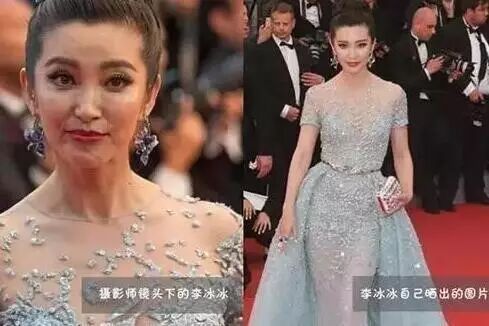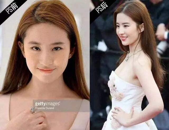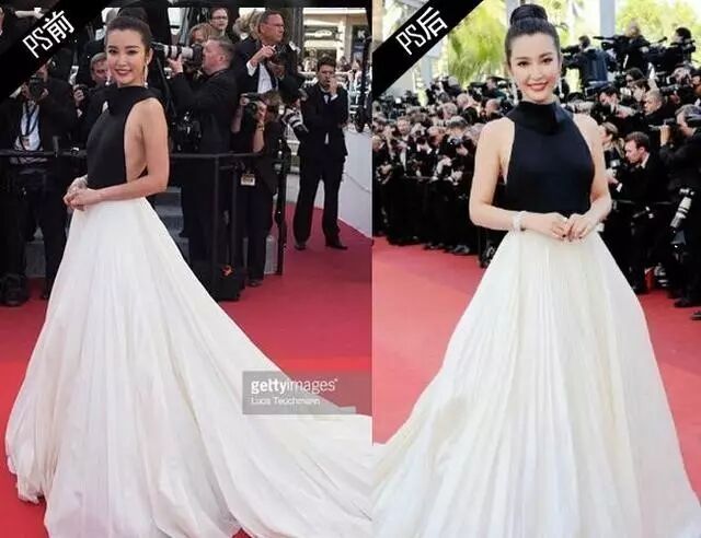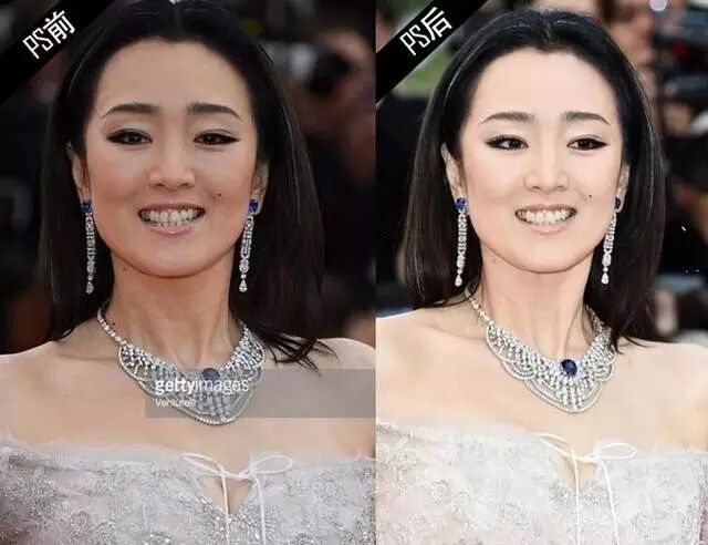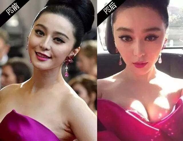 李冰冰这组对比照只调整了肌肤亮白程度,PS前后差别还不算大。