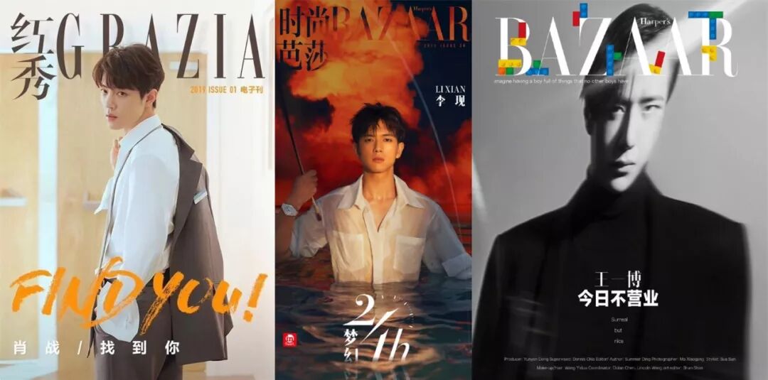 小生方面,暑期两个月,肖战已经有《尼龙NYLON》《红袖GRAZIA》《OK!精彩》《南都娱乐周刊》《上海电视周刊》五个单人封面,王一博的单人封面仅《尼龙NYLON》。