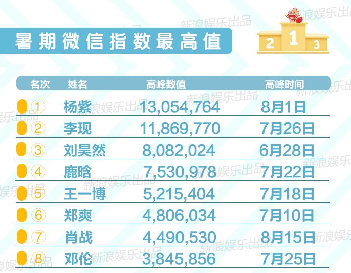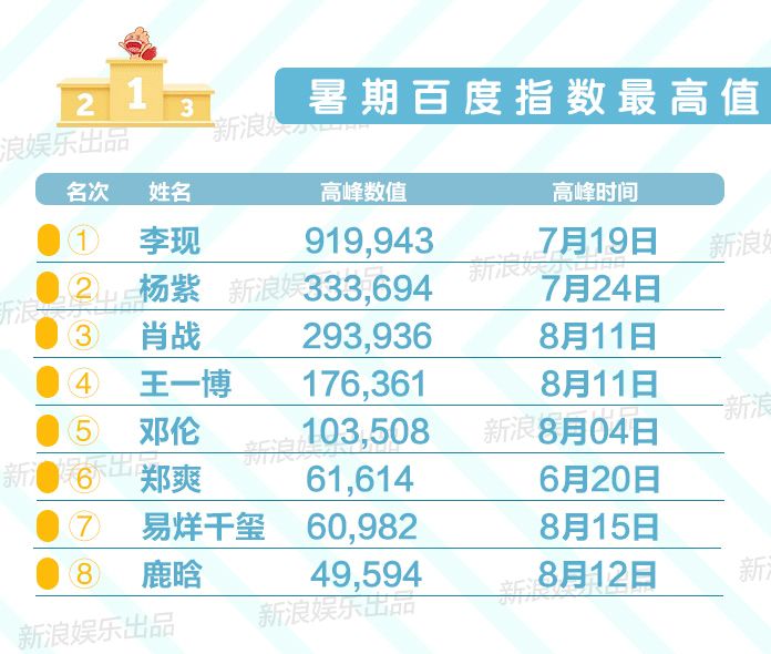 娱理工作室将统计范围定在6月16日至8月15日,梳理了微博热搜热力值排行、微信指数以及百度指数三大数据维度,每类数据选出数值最高的8位艺人,且入选的前提是他们在这个暑期有作品,最终,得出五位暑期档“顶级流量”:李现、杨紫、王一博、肖战、郑爽。