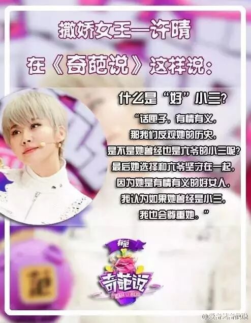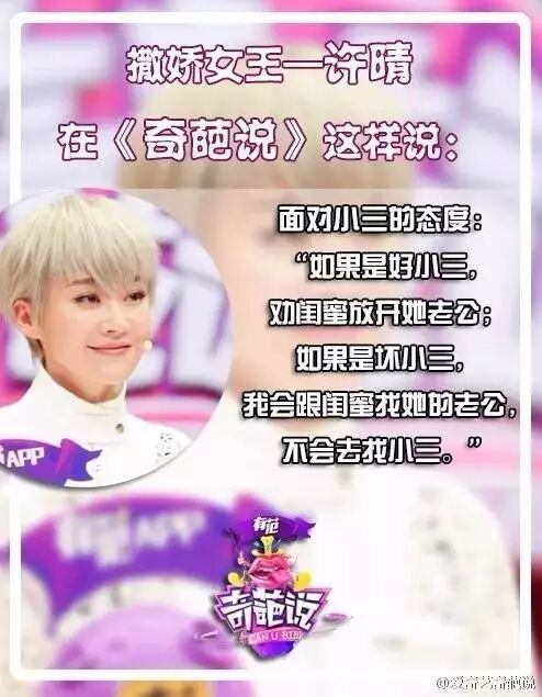 我们的公主大人许晴最近去了超火的《奇葩说》做女神嘉宾,这一期的辩题是这样的“闺蜜要去撕小三,约我一起,我要不要去?”。