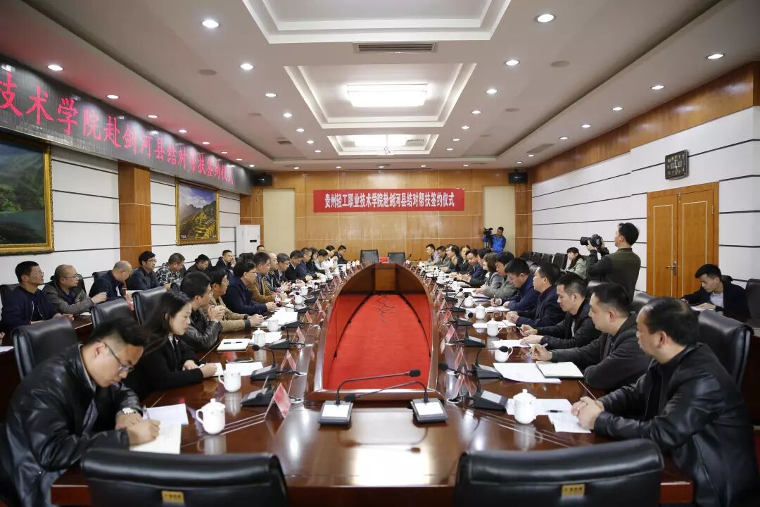 学院调研队伍一行首先与剑河县党委政府进行深度磋商,双方按照中共贵州省委、贵州省人民政府《2018年脱贫攻坚春风行动令》要求,结合《剑河县教育优质发展决战脱贫攻坚行动计划(2018—2020年)》实际,就构建三个机制(资源支持机制、智力支持机制、项目扶持机制)、推进四个项目(志智双扶项目、校农结合项目、职校专业重点扶持项目、逐步探索实施产教融合项目)达成共识,签订了《职教精准扶贫结对帮扶合作框架协议》,旨在充分发挥贵州轻工职业技术学院教育资源优势,以精准招生和精准资助为抓手、以精准培养和精准就业为载体、以精准培训和校农结合为突破口,强化扶智与扶志双推进,强化教育造血式扶贫功能,积极探索职业教育精准扶贫助推深度贫困县脱贫攻坚工作新机制和有效路径,为剑河县脱贫攻坚打下坚实基础。