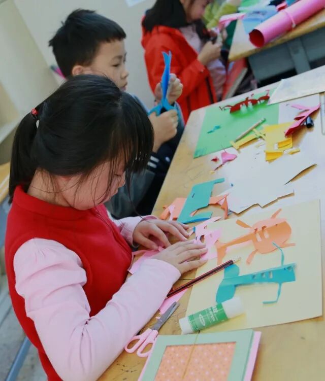 一年级“萌娃萌画小舞台”的涂鸦创意画、二年级“机器人总动员”的绘画、拼贴设计、三年级“炫酷新时尚”服饰设计、四年级“小手变变变”手形创意设计、五年级“朵朵鲜花送老师”瓶花剪贴创作。