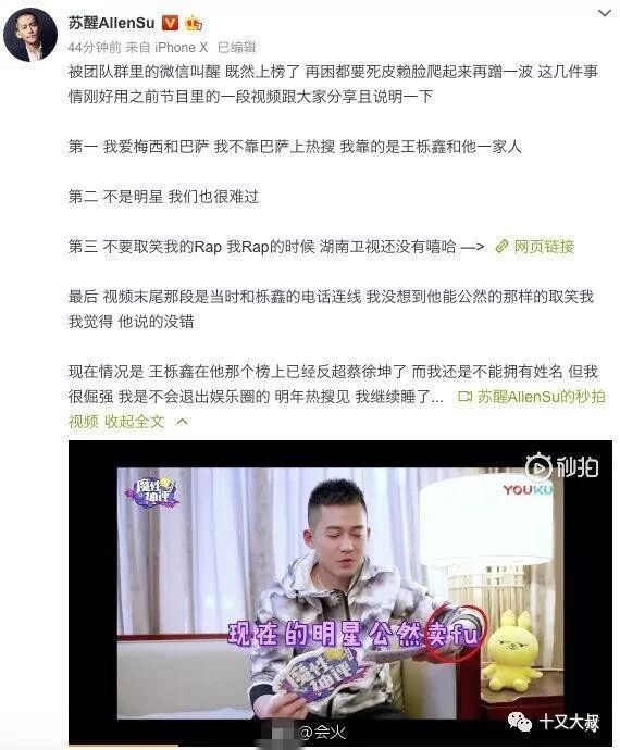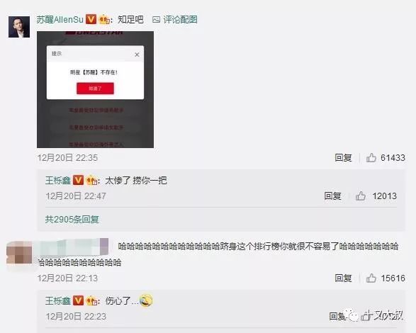 12月20日,王栎鑫晒出两张投票截图,图中显示为自己投票的人数为零。他发文自侃:“这么多年,我还能保持现在的人气,真的是不容易……”随后,苏醒在下方回复:“知足吧。”只见他配上一张截图,自己在某榜单里甚至不能“拥有姓名”,十分搞笑。王栎鑫回复苏醒:“太惨了,捞你一把!