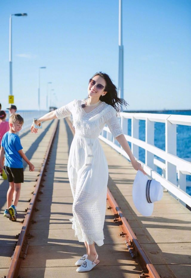 整个人还是笑得挺开心的,这个时候头发在随风飘扬,而且身上穿了一条白色的裙子,这条裙子穿在身上的话,看起来整个人就是仙气飘飘的,手里还拿着一顶白色的帽子,脚上穿了一双白色的高跟鞋