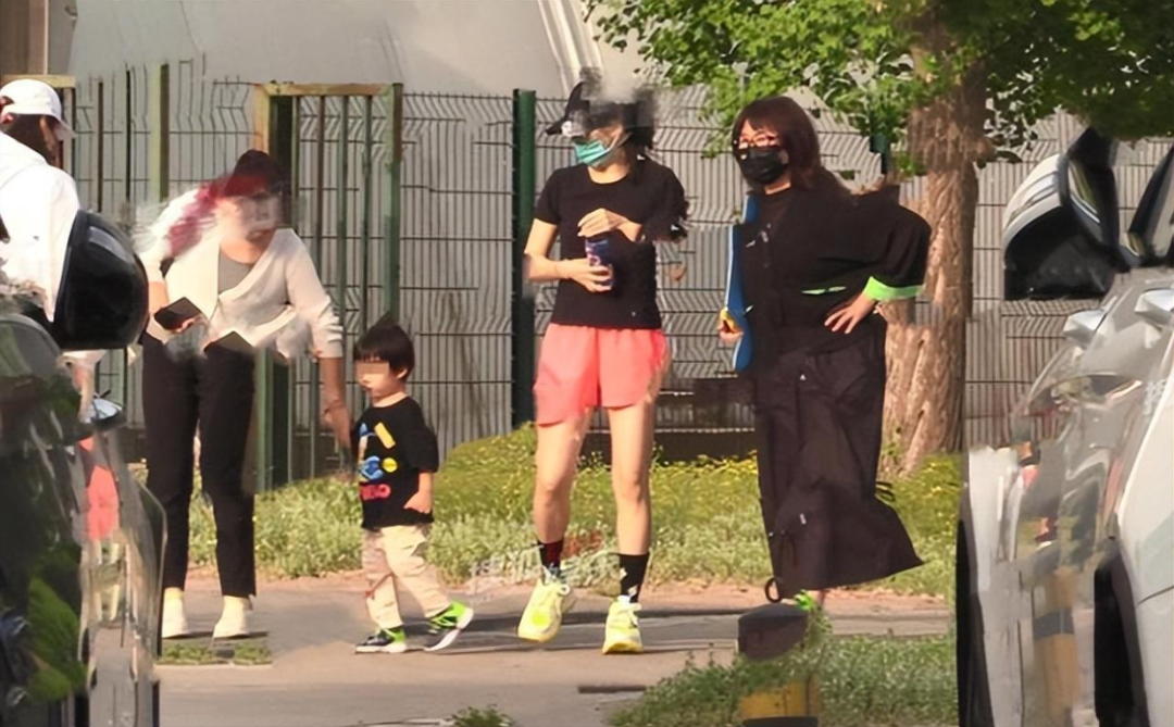 照片是别人抓拍的,这个时候是带着自己的小孩出去外面玩,打扮的也是比较的休闲,上面穿了一件黑色的短袖,比较修饰她的身材,下面就穿了一条粉色的裤子,而且下面的这一双腿的肤色还是挺真实的