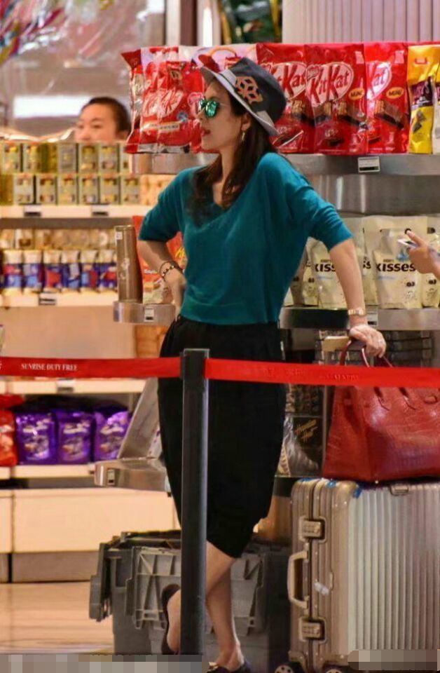 这次她是在超市里面可以看到她戴着一顶帽子,而且头发护理的也是挺不错的,看起来比较的顺滑,上半身穿的这件衣服选择的颜色是墨蓝色的,看起来也是挺高级的,下面就穿了一条黑色的裤子,比较的宽松