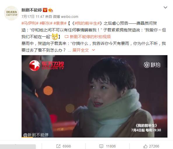 连着下面一条微博是《我的前半生》的新剧情进展,贺涵对罗子君表白。