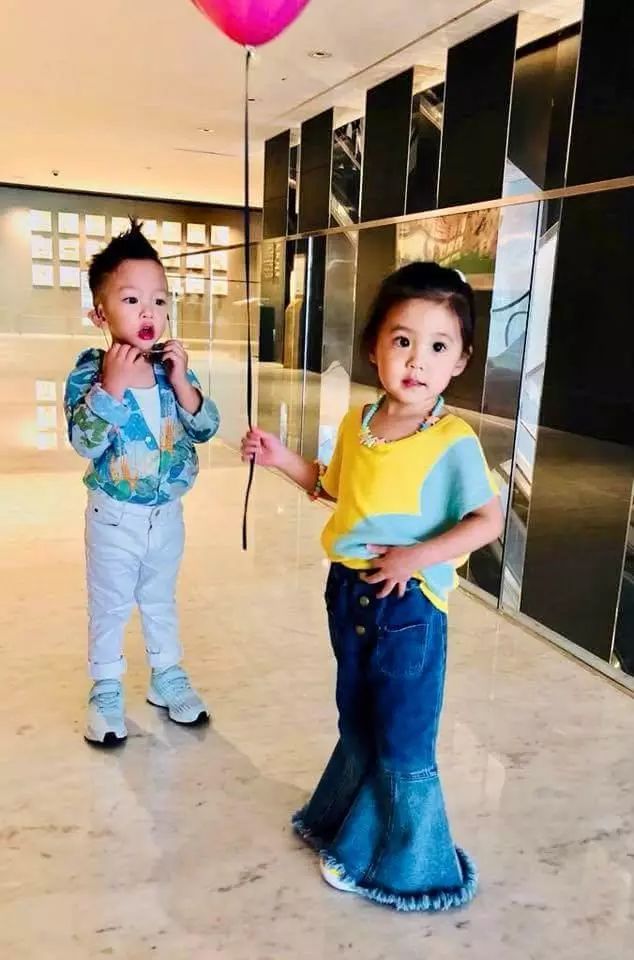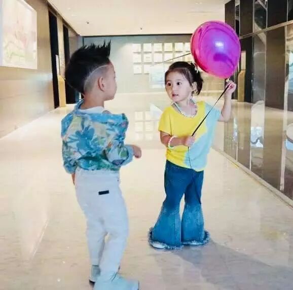 穿着复古喇叭裤、黄蓝拼接的小上衣真的是好漂亮,长大了肯定是个大美人,遗传了妈妈的好基因,两个孩子似乎玩耍的很愉快,小V宝好奇的看着咘咘,是想要咘咘手里的小气球么?