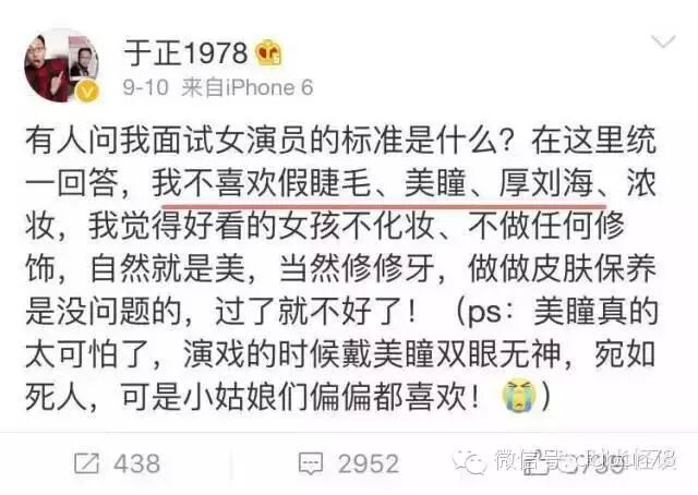 但搞笑的是,这部《云中歌》的制片于正妈妈,之前还在微博上发表了自己对于“美瞳”的一翻见解▼
