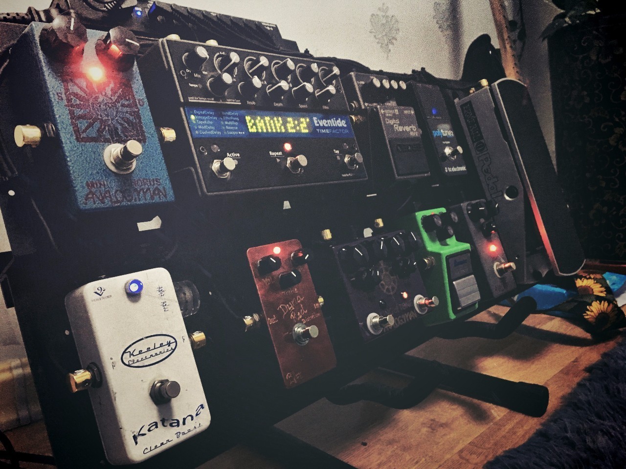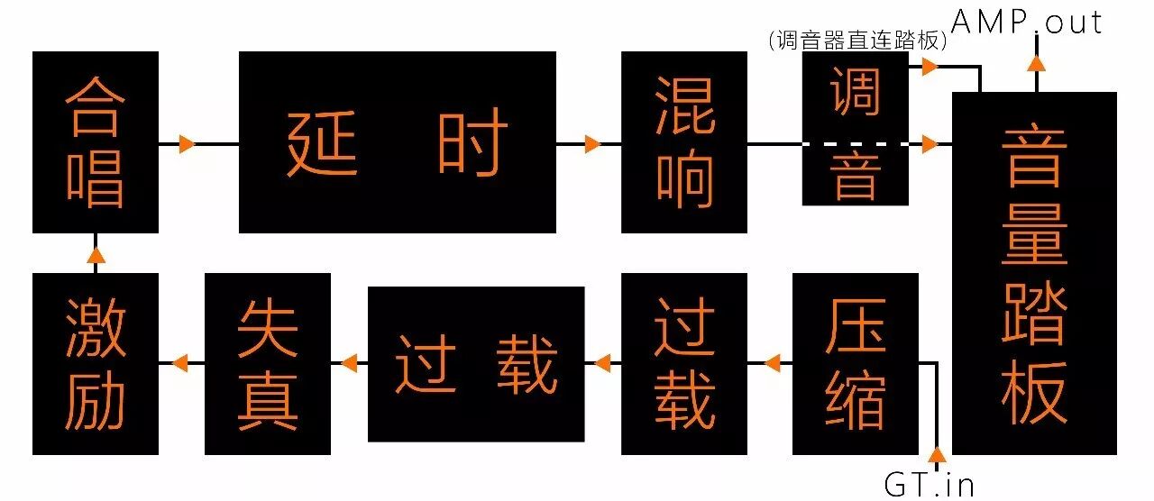 压缩→过载→过载+boost→失真→boost→合唱→延时→混响→音量踏板(调音表)