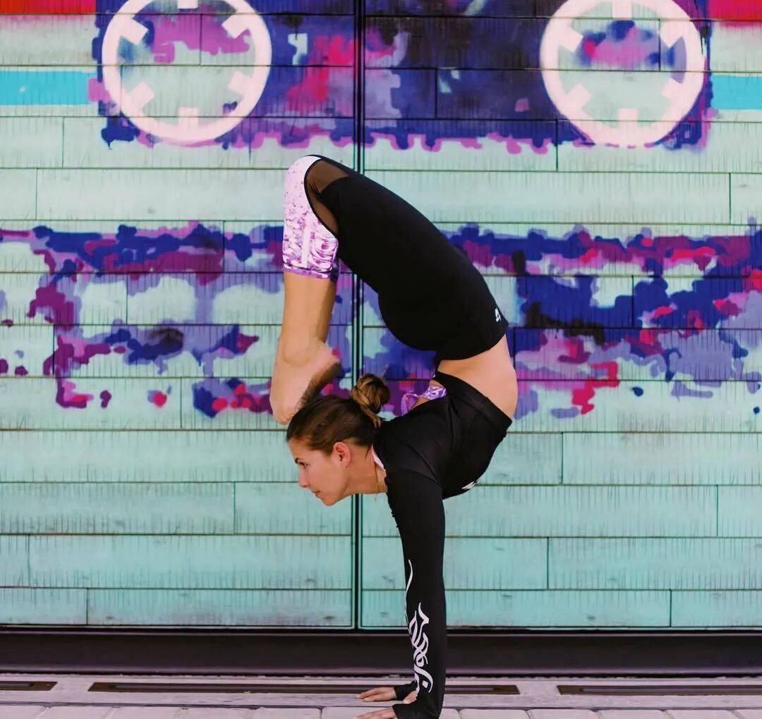 蝎子式,首先是双手伸直支撑在地上,然后让身体倒立起来,然后双腿并拢在一起,慢慢降低双腿重心,将小腿弯曲过来,然后上身保持一定弧度。
